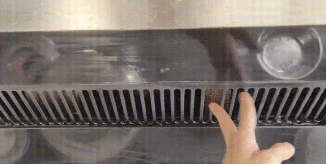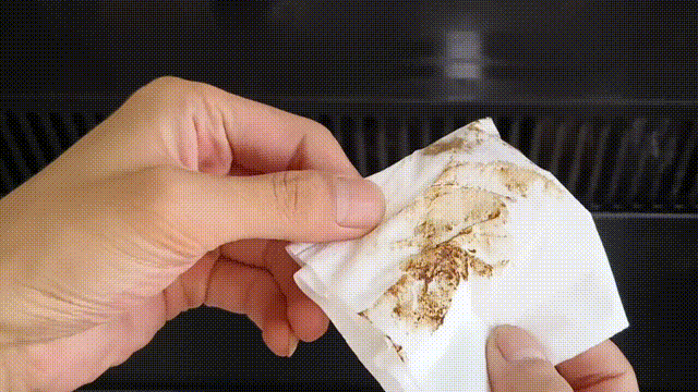 整个油烟机抹好后,别着急擦,等个几分钟,让清洁液充分渗透,把油渍慢慢溶解、泡软。这个步骤非常关键,决定了后面好不好擦。时间到了后,拿一条毛巾,放进热水里浸湿,再拧到不怎么滴水。擦一擦,你会发现,那又黑又黏的油渍,几乎是一抹就掉,非常的轻松。