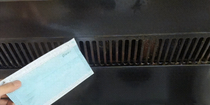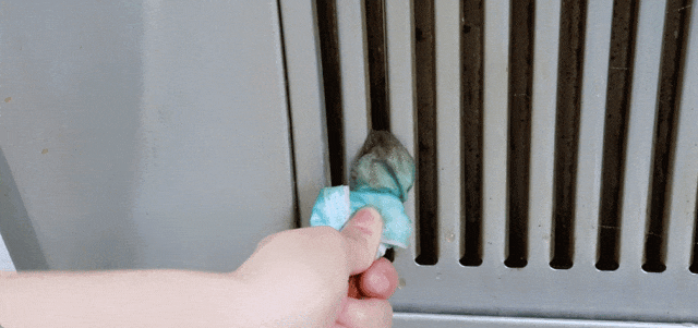 为了安全,先把油烟机电源拔掉。把一次性口罩随便一边剪开。把口罩套在手上,milan再用口罩的耳挂绳绑在手腕上,像戴了个手套一样,贴合又灵活。口罩本身柔软、有一定摩擦力,又吸油,用来擦油烟机真的太合适了。