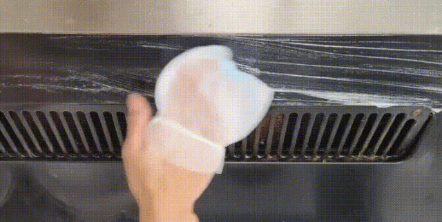 用包好的一端蘸着清洁溶液,伸进油烟机的凹槽和缝隙里,来回擦一擦,里面的油污会被口罩慢慢擦出来,再用干净的口罩擦一遍。如果一次没擦彻底,直接换一个新口罩再来一遍,用完的口罩直接扔了就行,特别的省事。