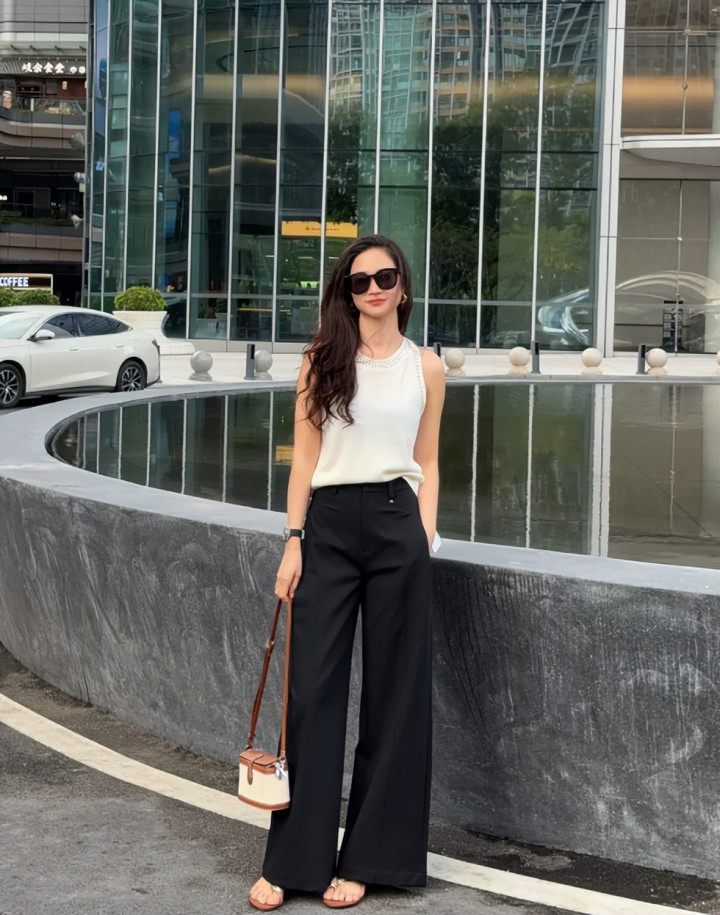西装面料的上风更光显,垂坠感强,显得总计这个词东谈主更利落。提议聘任直筒版型的长裤,milan把腿长腿直的特色展现得很迥殊。长度到脚背摆布就刚好,夏天搭配薄底鞋更欢娱。