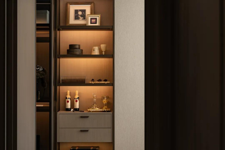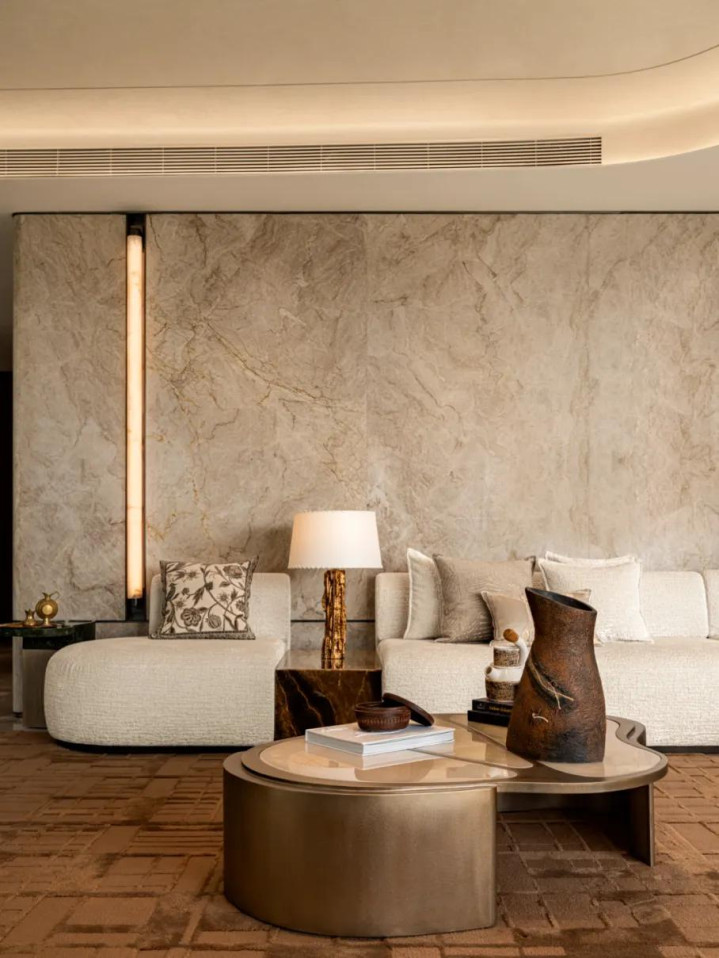 家与湖景的关系向来是相对的,人在家中,观湖的视角由心而定,一湖藏一心境,观湖亦是观心。而这份互动在室内同样双向,粼粼水光透进空间,远近湖景错落变化,自然与家居就此相融,同处于鲜活的律动之中。