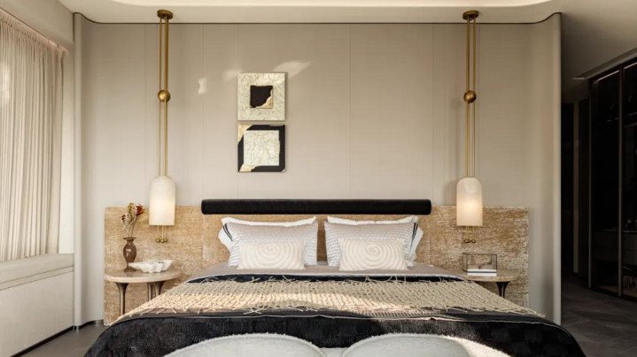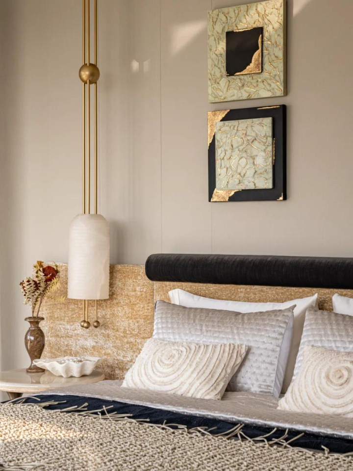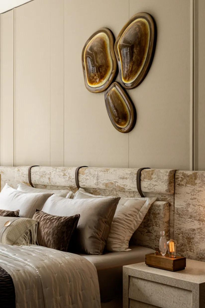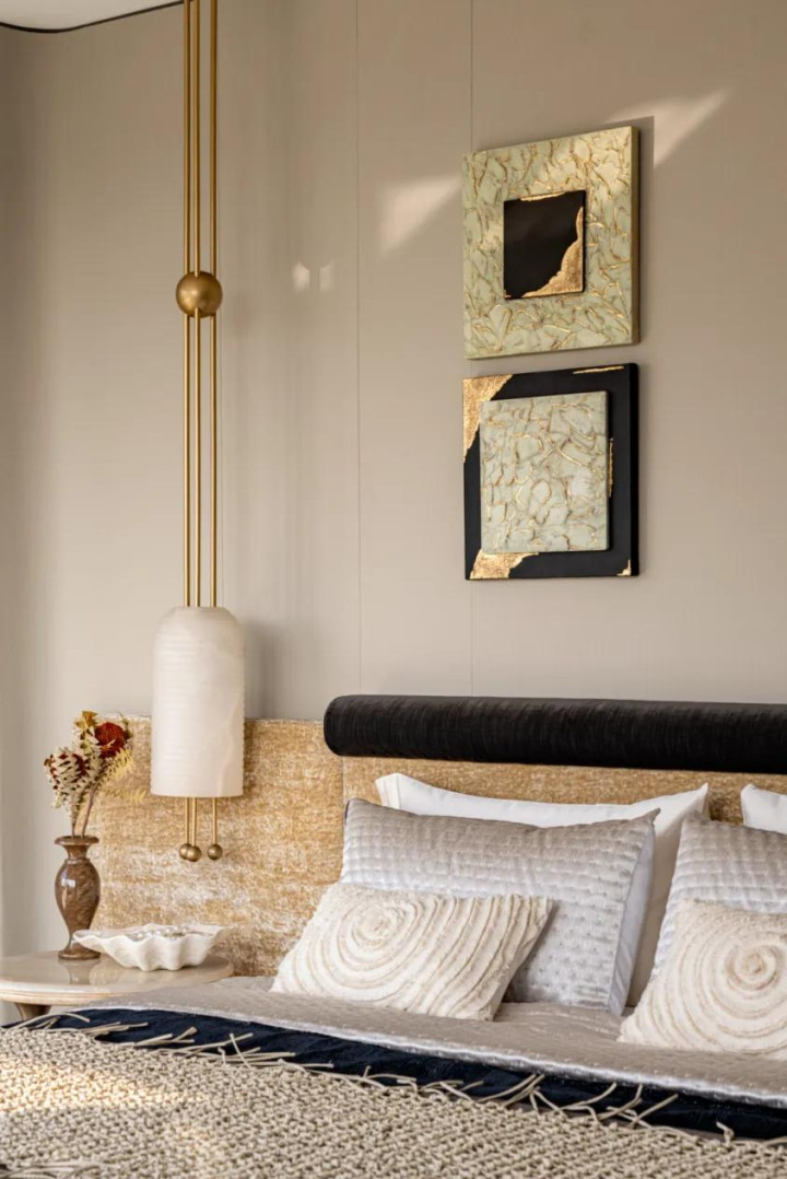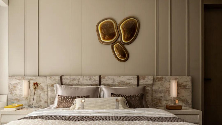 长辈房兼顾空间整体感的同时引入梅花、枝干元素,梅树坚忍不拔、历经岁月仍绽放艳色的品格,被赋予成美好寓意融入空间,让居所满含温情与期许。