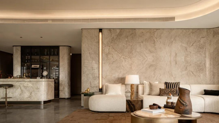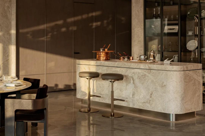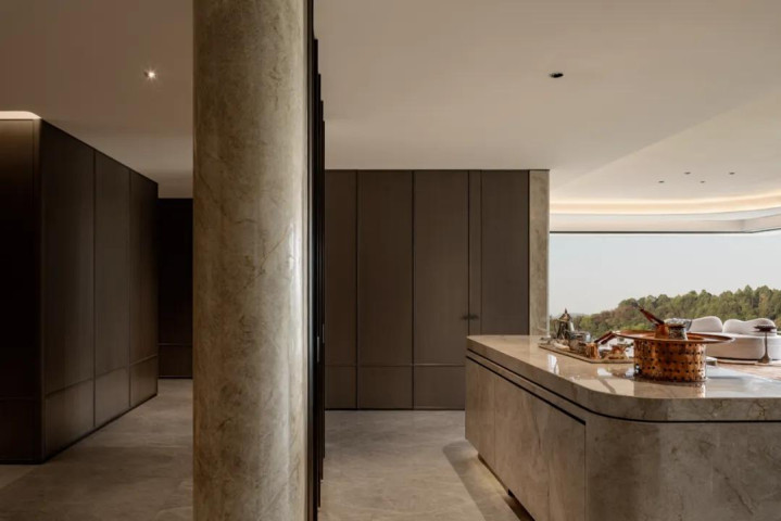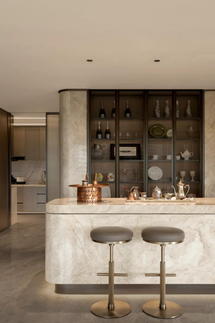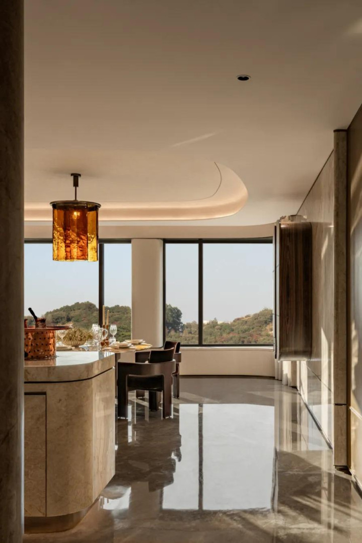 中性色承载起大地的沉稳质感,稳稳圈定出家居空间的边界。影壁后方打造酒柜,顺势衔接酒吧岛台与餐厅,岛台入目时,流线型落地窗已将窗外景观全部引入,实现了空间与自然的无缝衔接。