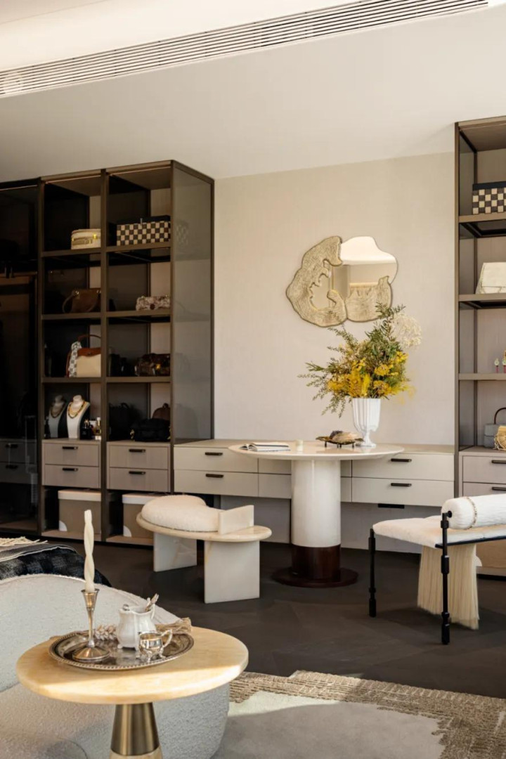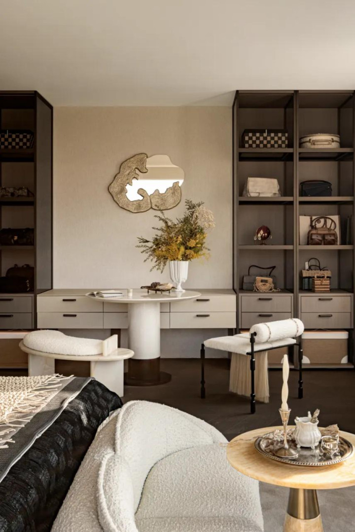 空间布局里,家具排布松弛又随性,仿佛时刻在“邀请人们”静驻坐下。梳妆台无需紧贴墙面规整摆放,正如背景柜前的一桌二椅,凭这份闲适感,就能让居住体验更具舒适感。