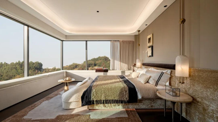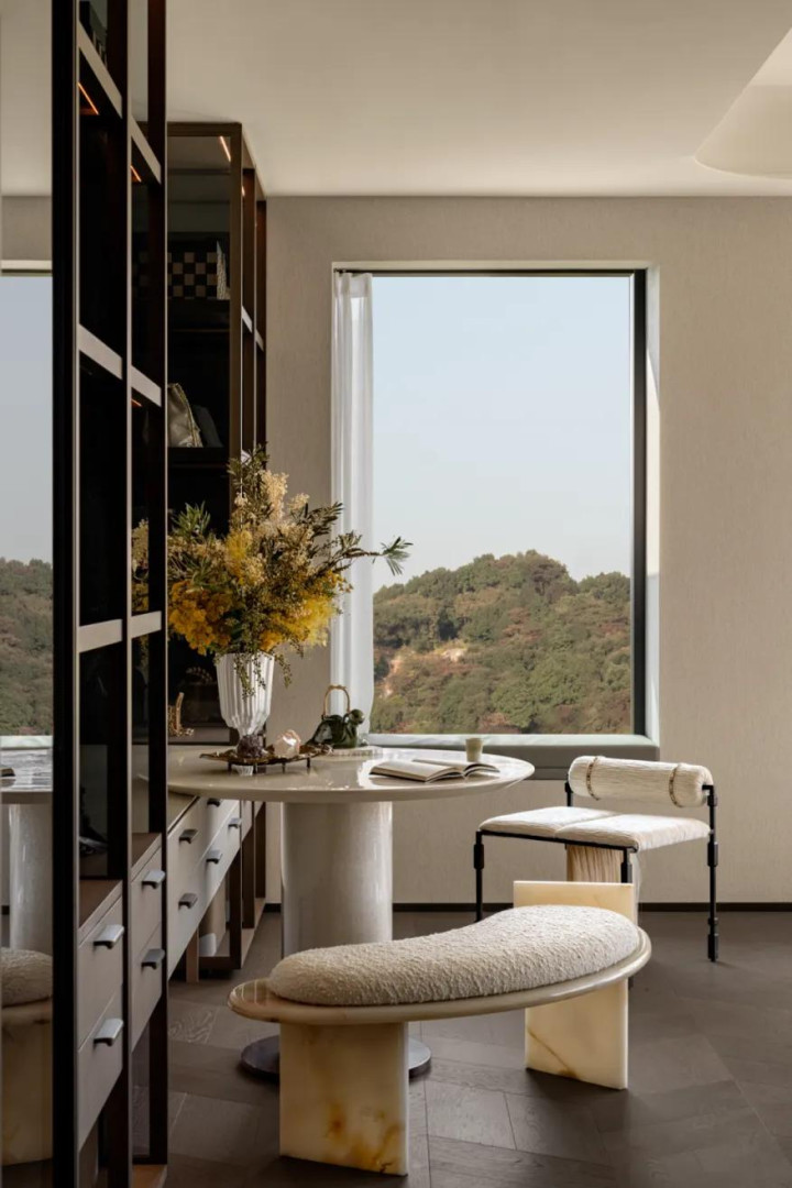 270°落地窗为卧室带来流动的景观视野,使静态的自然意境重新回归到自然与家居同频的整体氛围中。除了视觉享受,清风、暖阳与山野湖景的轮廓也借着光线映入室内,融入空气,更融入居住者的日常生活。