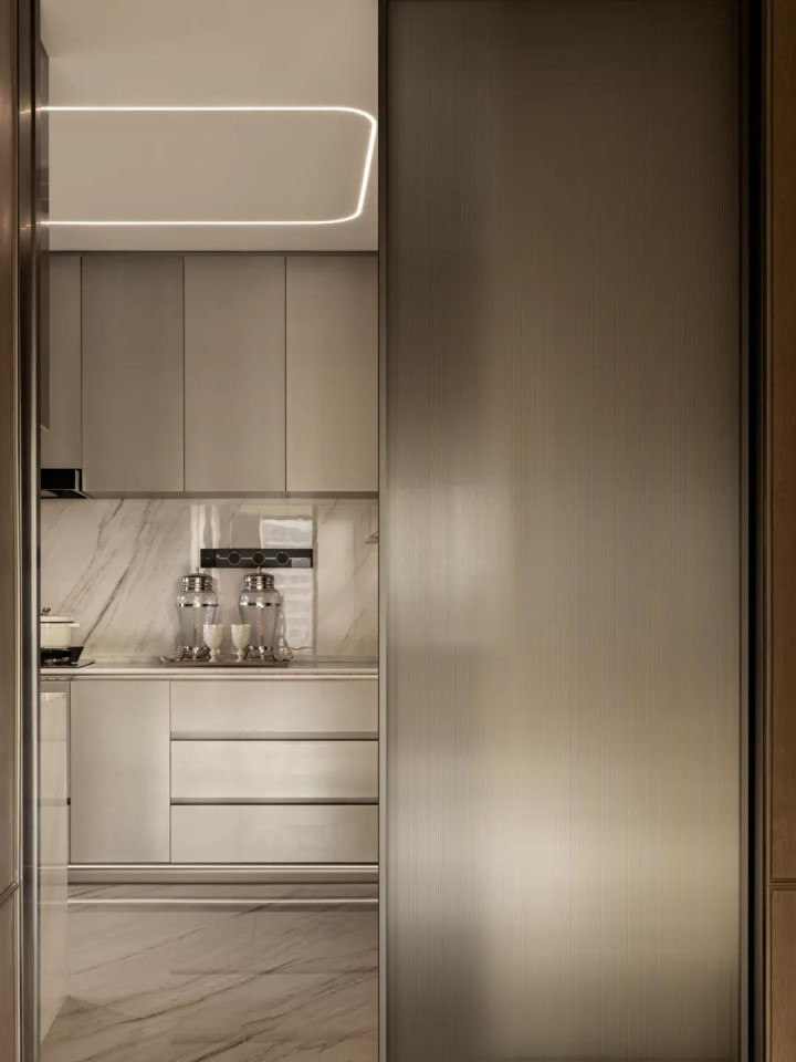 厨房设于空间偏后侧,采用灵活的错位设计,中西分厨摒弃了传统的衔接式结构。银白色调尽显高级优雅,磨砂门不仅能有效阻隔油烟,还能营造出专注的烹饪环境,兼顾实用与美感。
