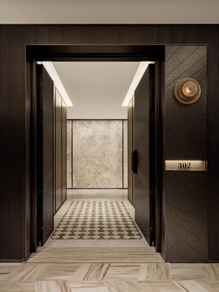玄关设一方影壁,简约格纹向内层层铺展,为空间蕴蓄出内敛的张力。对称的几何结构尽显沉稳规整,以严谨的序列感,在家居与外界之间勾勒出一方过渡的边界,禅意与秩序在此相融。