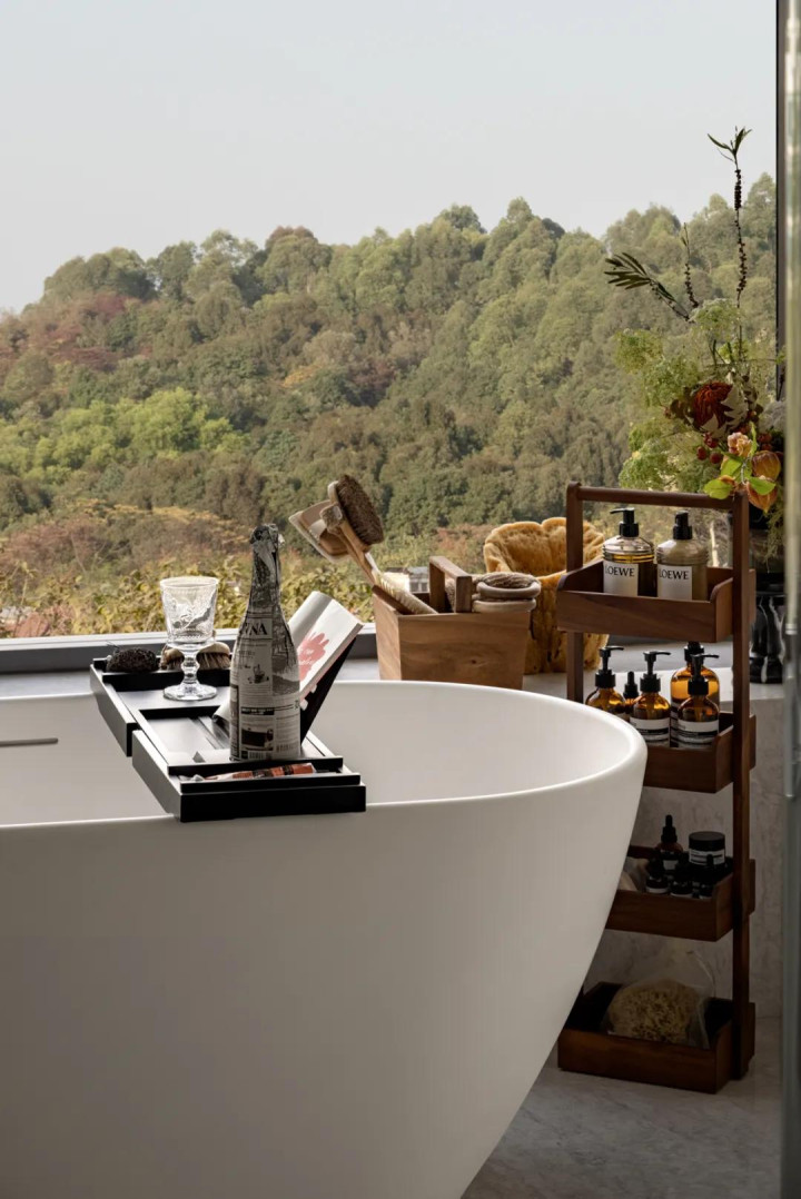 浴室依着一方落地窗而建,设计师将其全然融入自然怀抱,让空间沉浮于山野景致之间。这般设计看似是对外部的“敞开”,实则以别样视角,妥帖守护着私密感。