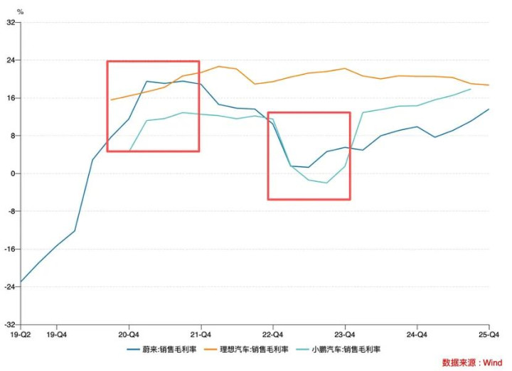 与此同期咱们也提防到2025年之后,理思毛利率初始展现出下行的趋势,与此同期小鹏和蔚来的毛利率又在执续改善中,上图中三条折线初始逼近。
