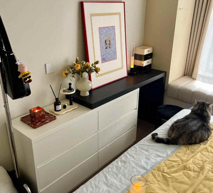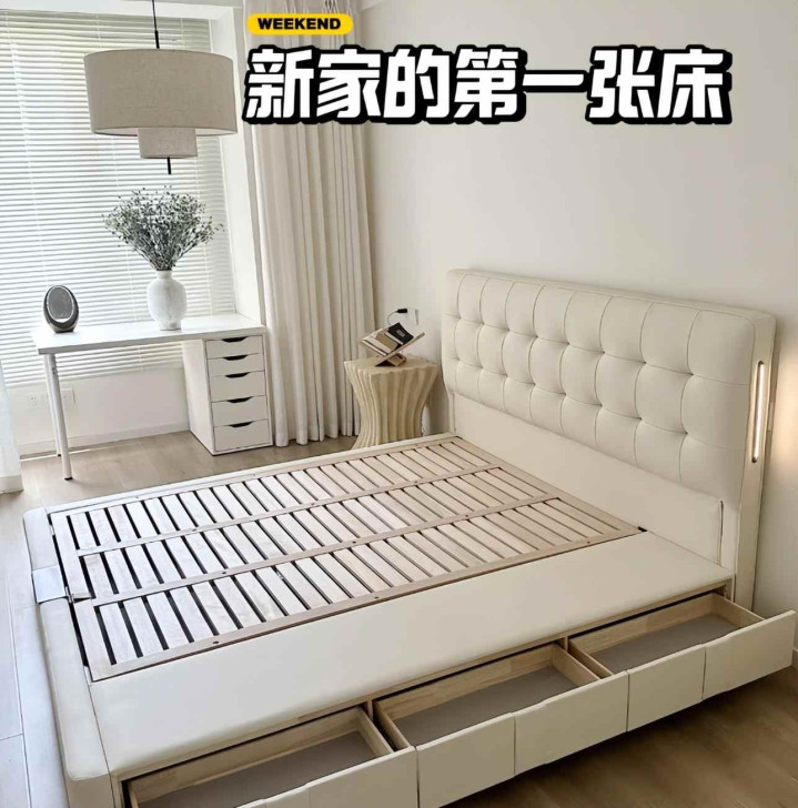 很多人买床的时候根本不去量一下尺寸,卧室宽度只有两米九,床加上两边的床头柜就要三米二,硬塞进去只能靠墙摆,床头柜没地方放,梳妆台也挤不进来,窗户通风还被挡了一半,床底下容易积灰,想打扫就得挪床,一个人根本搬不动,有人用扫地机器人打扫,结果机器卡在床底出不来,最后还得自己蹲下去把它掏出来。