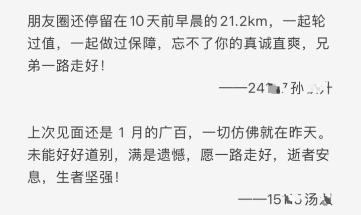 记者谨慎到,在哀辞末尾,还附有28名队友对蒋彦强的记忆念传话。有队友深情担心:“庸东谈主昆玉,你的ID就像你这个东谈主,鄙俚浩大。你的谈吐行为恍如目前,痛肉痛心,一齐走好……”也有队友传话:“愿你此次是轻装徒步峻岭云海,不再重装,带着你的通盘怜爱和好意思酒。”还有队友回忆谈:“一又友圈还停留在10天前清晨的21.2km,一齐轮过值,一齐作念过保险,忘不了你的诚恳爽快,昆玉一齐走好!”