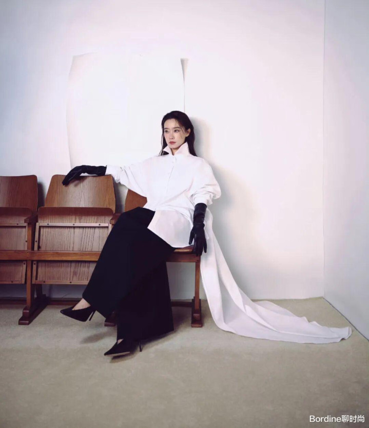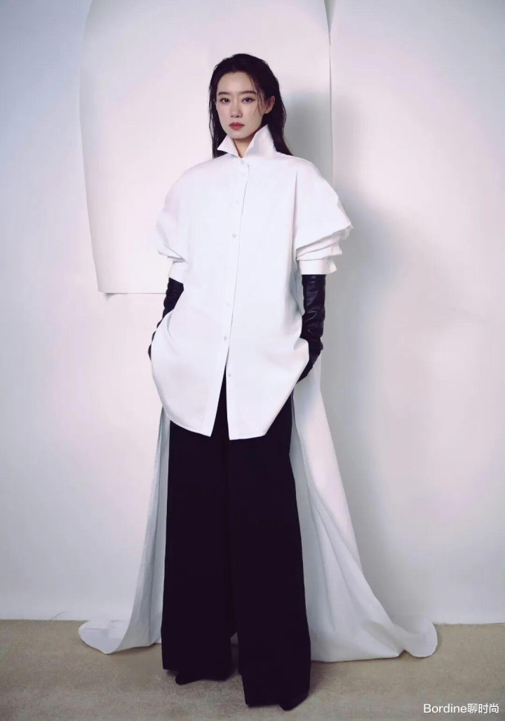 她遴荐了一件oversize廓形的立领白衬衫,最惊艳的策画在于背后的拖地长摆,走路时随风飞动,须臾让平凡的白衬衫有了战胜般的庆典感。肩部的泡泡袖策画奥妙地中庸了立领的硬朗,增添了一点柔好意思感,同期还能修饰肩线,对溜肩、窄肩的女生相等友好。
