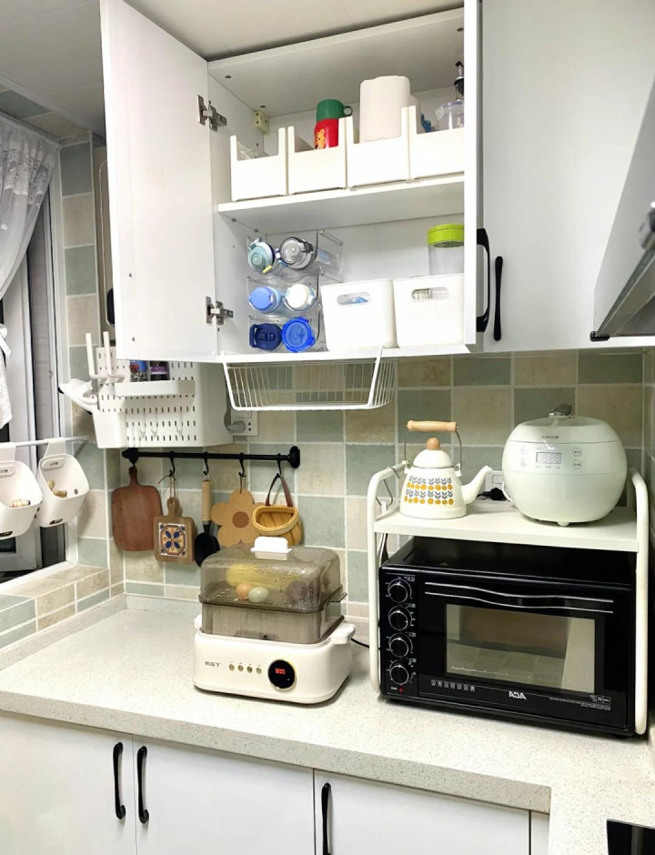 布局理顺了,现在来攻克柜子内部。小厨房的收纳,精髓在于“见缝插针”和“立体使用”。