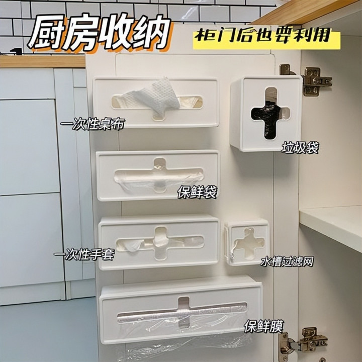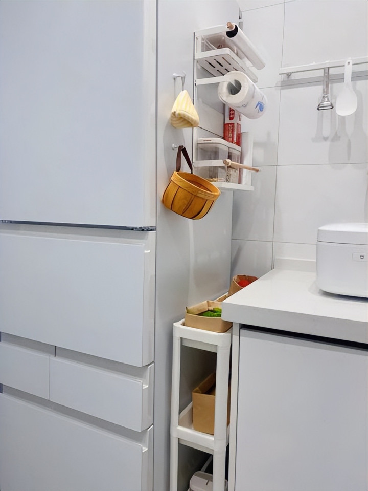 神操作3:冰箱侧面也别放过。 磁吸式收纳架简直是神来之笔!厨房纸巾、保鲜膜、隔热手套这些轻物挂上去,又省了一个抽屉的空间。