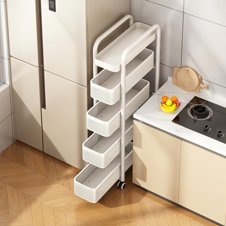 神操作6:巧用“缝隙神器”。 冰箱和橱柜之间那点缝,买个窄缝小推车,放饮料、零食、杂粮,完美利用。橱柜之间的窄缝,也有专用的超薄夹缝柜,收纳力惊人。