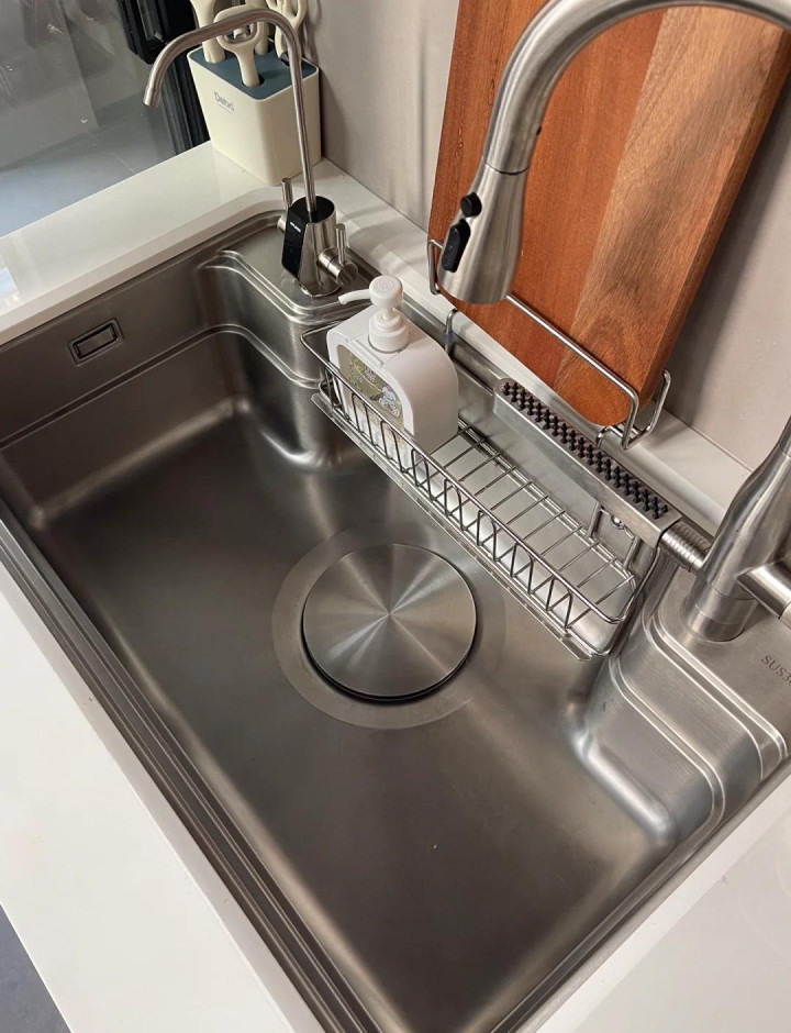 神操作2:水槽区利用到极致。 水槽上方窗台,可以放沥水架;水槽下方柜门内侧,贴个挂篮放清洁袋、刷子;水槽里面,放个可伸缩的置物架,洗碗海绵、清洁剂都有地儿了,台面自然空出来。