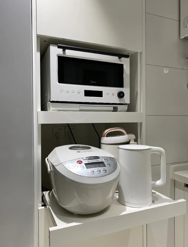 神操作9:给家电找个“家”。 电饭煲、空气炸锅、破壁机……小家电是小厨房的痛点。要么在规划时留出专门的家电高柜,要么用一个可移动的多层小推车来安置它们,用的时候拉出来,不用时推进角落,绝不占用核心操作台面。