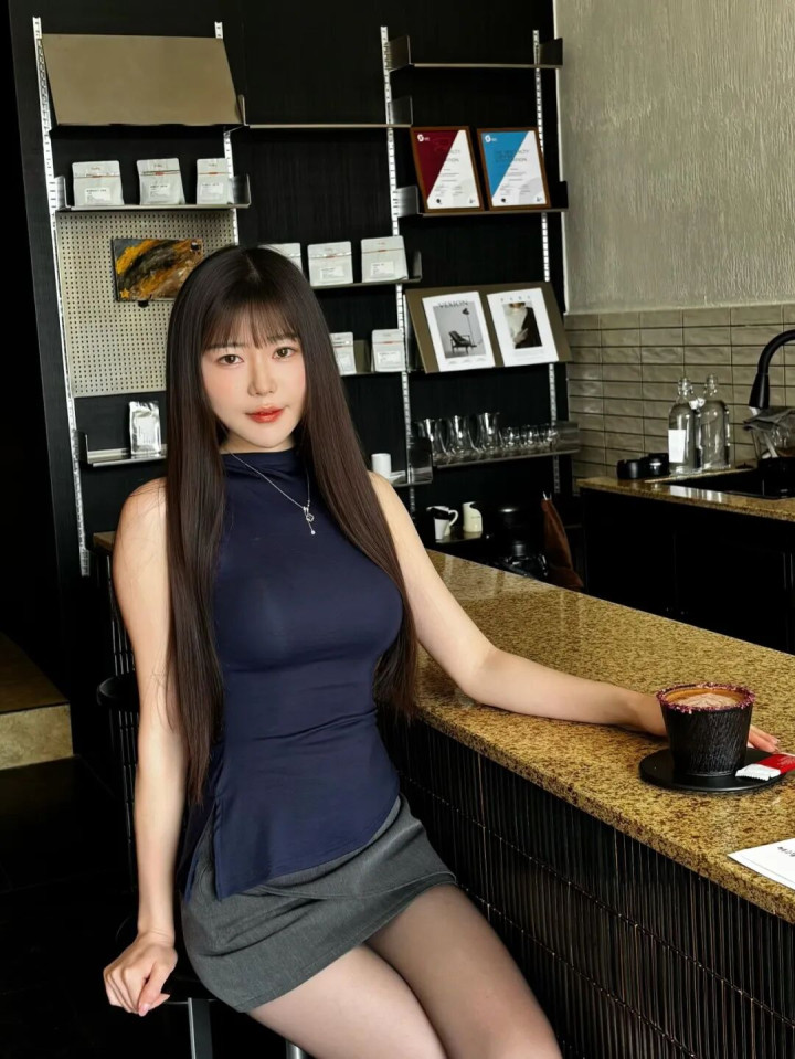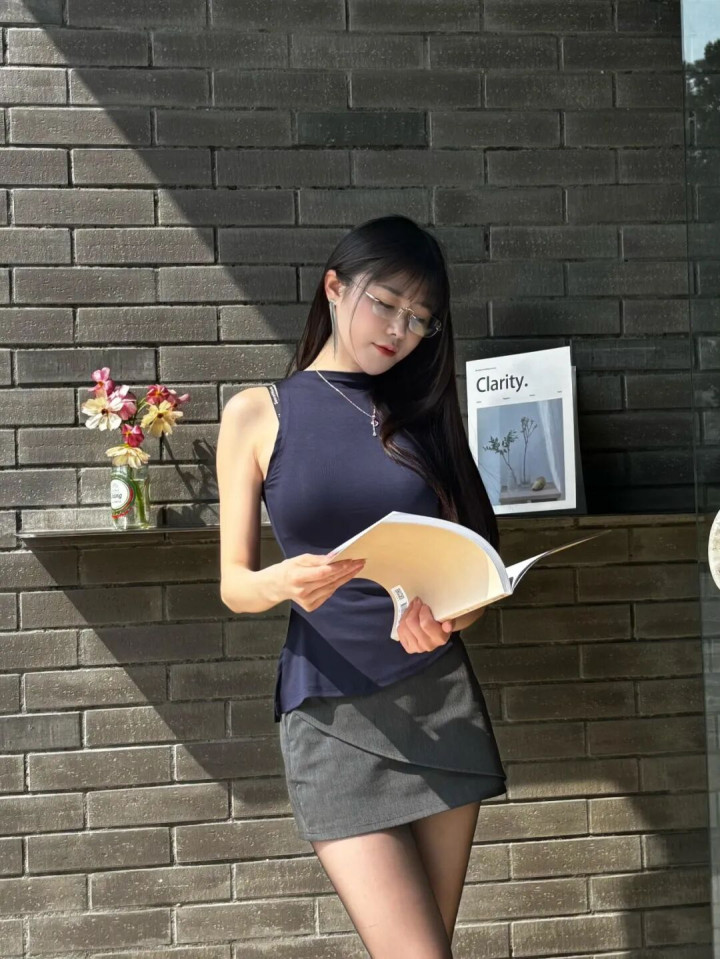 milan 颜值穿搭: 深蓝色无袖上衣+灰色不章程贪图半裙+钻饰小高跟