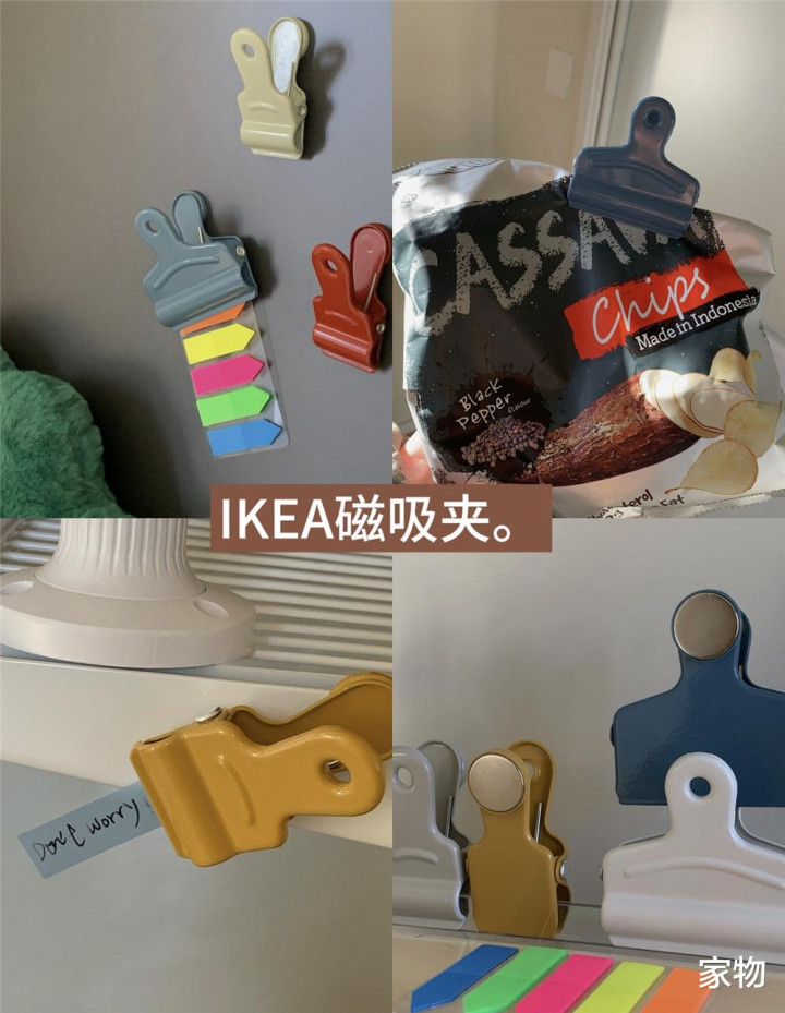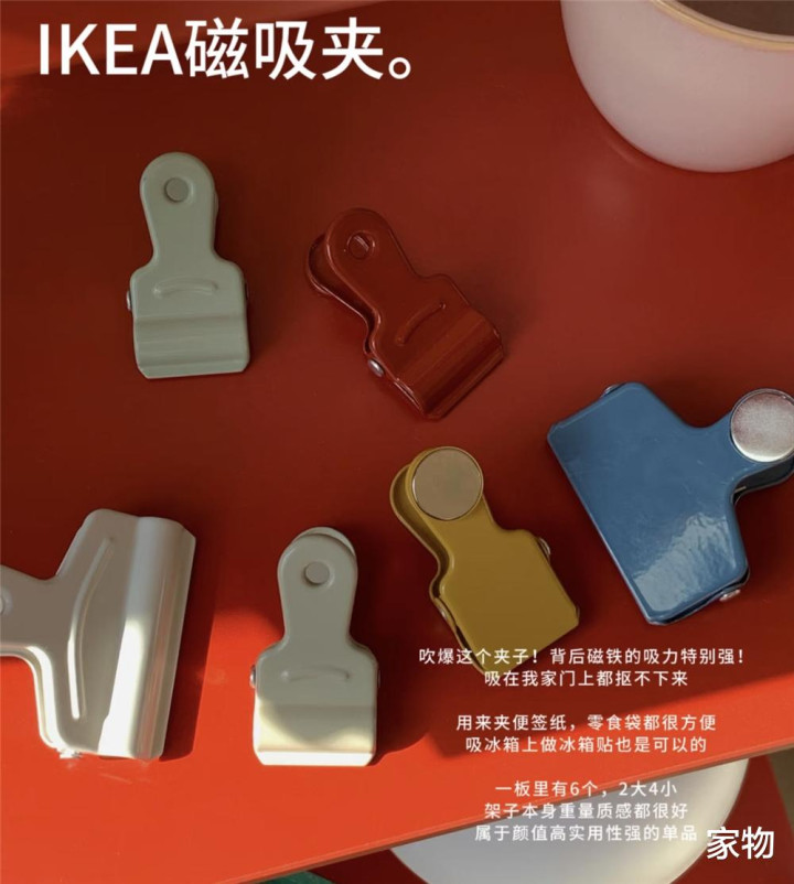 我真的要吹爆这组夹子!一板里面有六个(四小两大),颜色各异,而且夹子头的位置还有防滑设计,最关键的是,每个都带磁吸扣,可以吸附在冰箱门或者家里防盗门上,当做收纳、固定备忘页的夹子,好用极了。