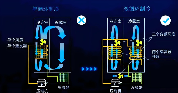 单循环:冷冻室和冷藏室共用一套制冷系统。你想想,冷冻室的鱼腥味随着冷气循环到冷藏室,你的蛋糕和水果还能好吃吗?