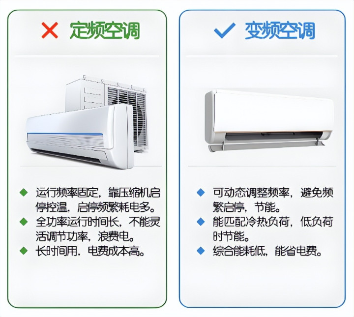 定频空调:温度到了就停机,冷了再启动,忽冷忽热,体感差还费电。
