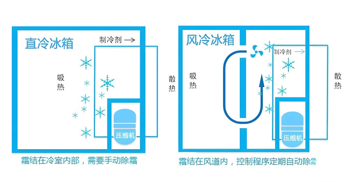 直冷冰箱:内部会结霜,需要定期手动除冰,麻烦且制冷不均匀。