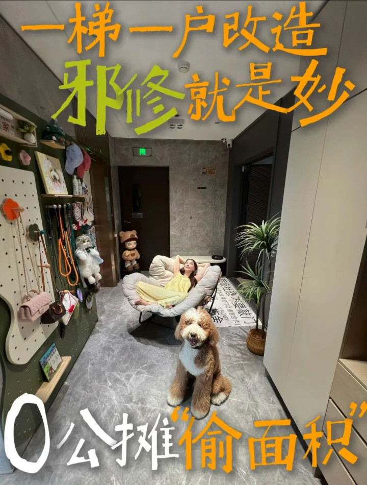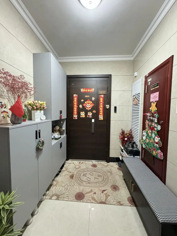 以前住两梯四户,电梯门一开就是冷冰冰的走廊,邻居家的鞋柜、婴儿车、垃圾袋随处可见,每天像闯关。
