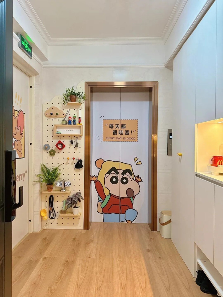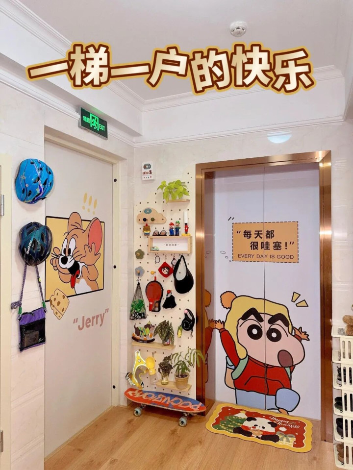 电梯门贴上漫画壁纸、放了香薰、摆两盆绿植点缀,每天出门赚米、下班归家,瞅着这温馨的空间,打工人的怨气都少了一半。