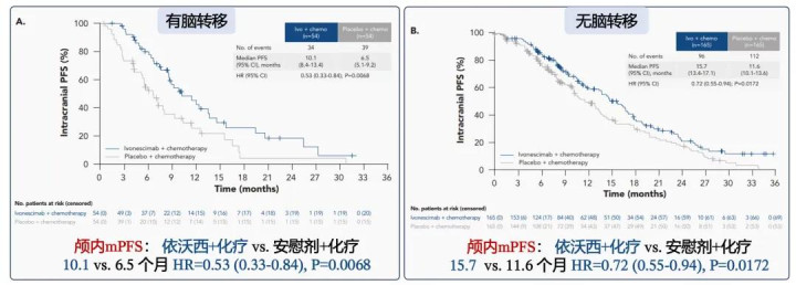 HARMONi参议共纳入438例三代EGFR-TKI进展后的EGFR突变NSCLC患者,其中基线伴脑挪动者108例(每组各54例)。ELCC公布的罢了显现[1],依沃西颐养组在基线伴有脑挪动东说念主群的颅内mPFS达到10.1个月,而对照组为6.5个月,HR=0.53(0.33-0.84),P=0.0068。在基线无脑挪动东说念主群中,依沃西颐养组的中位颅内PFS达15.7个月,也权贵优于对照组的11.6个月,HR=0.72(0.55-0.94)。