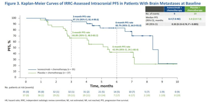 HARMONi-A参议脑挪动亚组分析一样显现[7],在基线伴脑挪动东说念主群中,依沃西颐养化疗组的颅内PFS达8.4个月,对照组仅5.4个月(HR=0.33,P=0.005),6个月颅内PFS率差别为83.7%和42.9%。这意味着,依沃西颐养化疗可将脑挪动患者的颅内进展风险裁汰了67%,6个月的颅内无进展活命率翻了一倍!