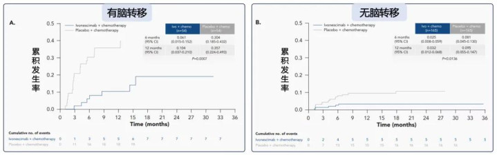 更令东说念主惊喜的是,依沃西颐养组在6个月和12个月的脑挪动积累发生率均权贵低于对照组。在基线伴脑挪动东说念主群中,依沃西颐养化疗组6个月和12个月的颅内进展积累发生率差别为6.1%和10.4%,而对照组则高达30.4%和35.7%(P=0.0007)。在基线无脑挪动东说念主群中,依沃西组的6个月和12个月的脑挪动积累发生率差别仅为2.5%和3.2%,对照组则为8.1%和9.5%(P=0.0136)[1]。这证明对于基线无脑挪动的患者接纳依沃西颐养化疗颐养的脑挪动积累发生率比对照组减少了2/3,在依沃西颐养1年时,仅有3.2%患者发生脑挪动。这种互异充分证明了依沃西在颐养和珍视脑挪动上的上风,依沃西可能具有“脑保护”的作用机制以裁汰脑挪动的风险。